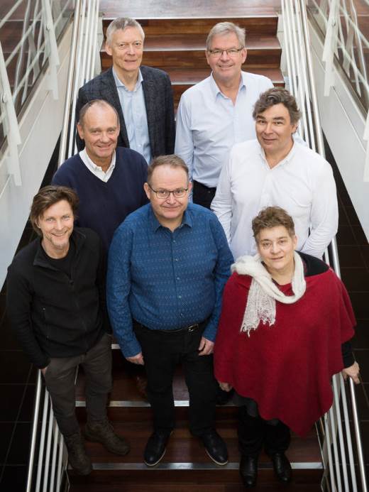 iPSYCH består af øverst fra venstre professor Ole Mors, AU og AUH, direktør i iPSYCH Kristjar Skajaa, afdelingsleder David M. Hougaard, Statens Serum Institut, professor Thomas Werge, Region Hovedstadens Psykiatri, professor Anders Børglum, AU, professor Preben Bo Mortensen, AU og professor Merete Nordentoft, Region Hovedstadens Psykiatri.