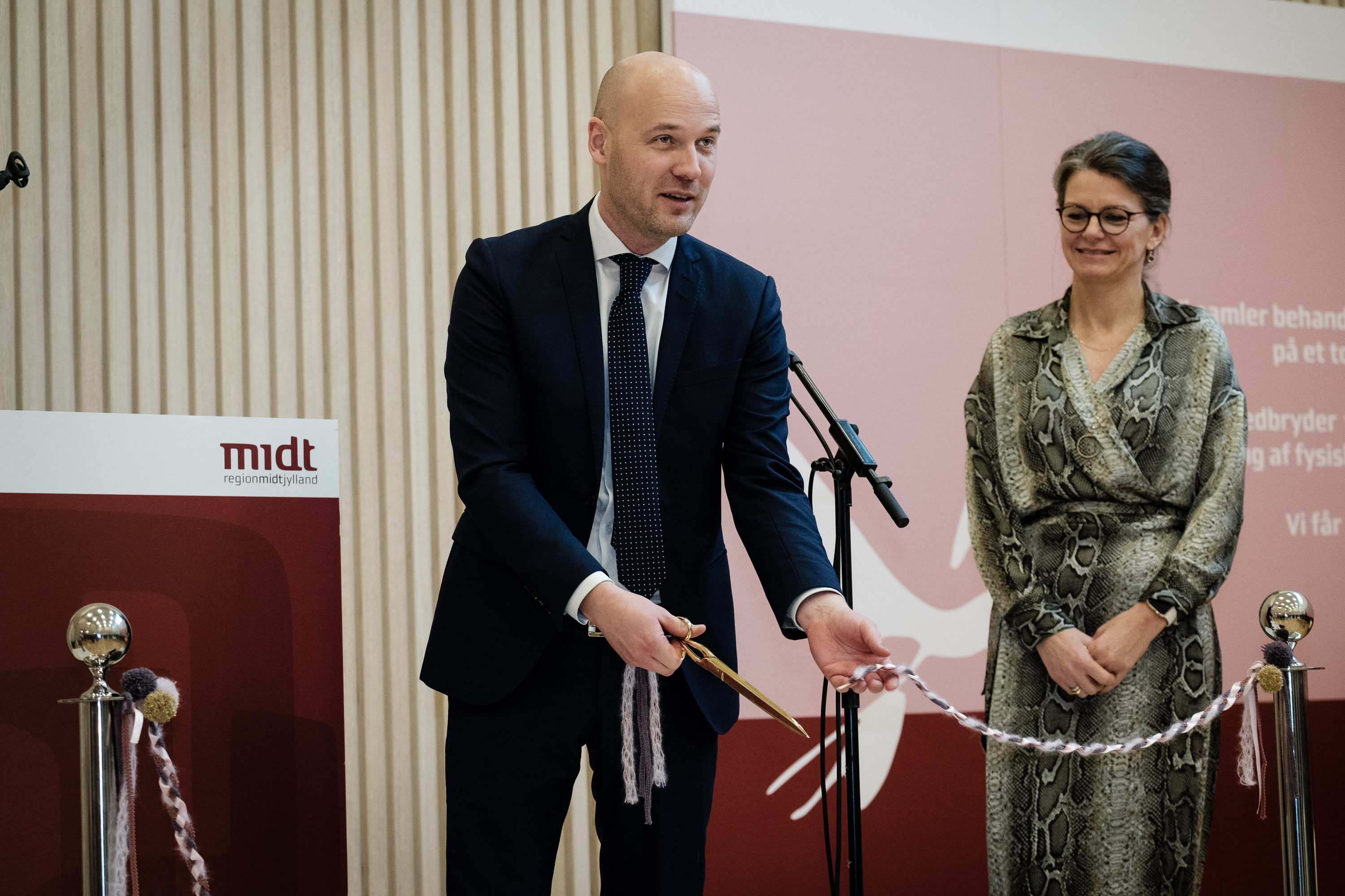 Regionsrådsformand Anders Kühnau (S) indviede Aarhus Universitetshospital Psykiatrien med et rask snoreklip. I baggrunden ses Tina Ebler, direktør for Psykiatri og Social. Foto: Region Midtjylland/Jesper Voldgaard