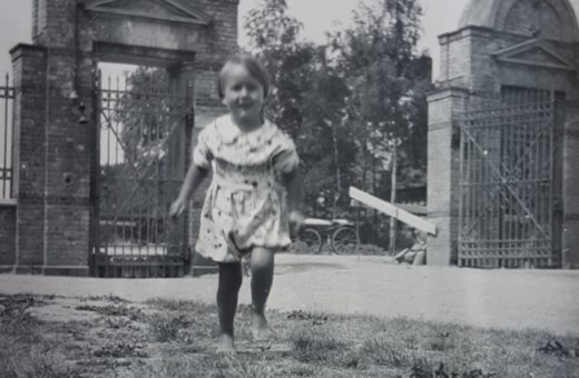 Bente Grøn-Nielsen som barn foran porten på hospitalet i Risskov. Privatfoto