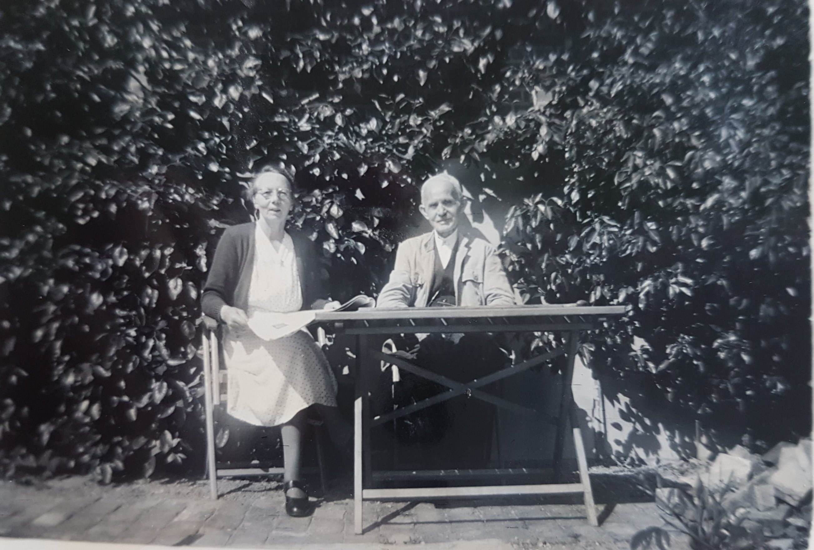 Bente Grøn-Nielsens bedsteforældre i haven på Lerbækvej. Privatfoto